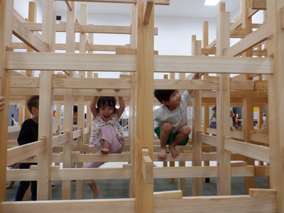 大学の住居デザイン科の学生が組み立てた ”木のジャングルジム” が 昨日まで 大学А館ホールに設置されていました。