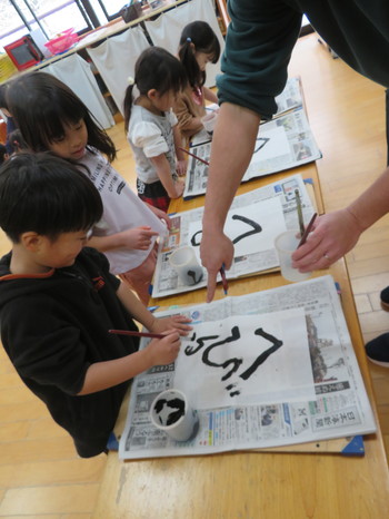 さくらんぼ組のお隣さんの ふじ組(5歳児)は筆をもって 「へび」にチャレンジ!!