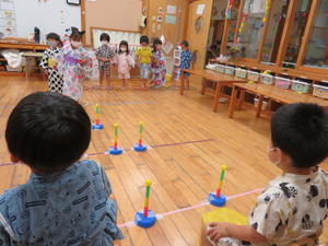 音頭の後は いろいろなコーナーであそんだよ ちゅうりっぷ組にできた お店では